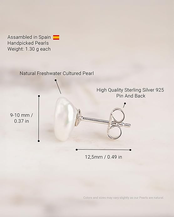- PEARL DETAILS AND SIZES | Origin: Freshwater Cultured Pearls | Shape: Keshi | Brightness: Intense, it's the most important quality | Color: White | Surface: Clean | Size: 7-8 mm, 8-9 mm, 9-10 mm, 10-11 mm, 11-12 mm, 12-13 mm, 13-14 mm, 14-15 mm and 15-16 mm. First 4 sices come with 6 mm backs and the others with 9 mm for much better support. See photo with measurements. The model is also using the correct size in each photo.