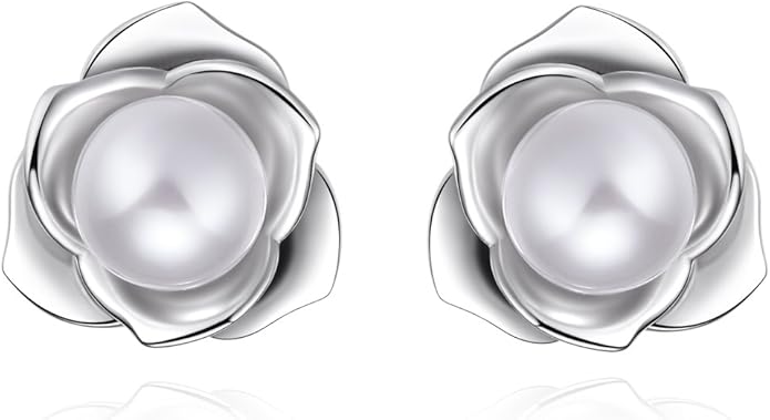 "Lovely Rose" High Polished 925 Sterling Silver Earrings with 7mm Natural Freshwater Pearl