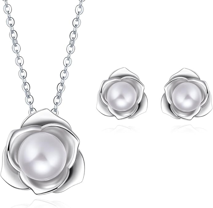 - 3, [Design] Rose pendant shaped by 925 sterling silver,freshwater pearl gentle and beautiful, delicate and exquisite.Perfect combination of the pearl and white-gold plated silver luster gives you a peculiar visual feast and endows a charming imagination and innovation to this elegant jewelry.Sterling silver pearl nacklace as a gift everyone will enjoy.Suitable any color of clothes, any style and attendance at different occasion.