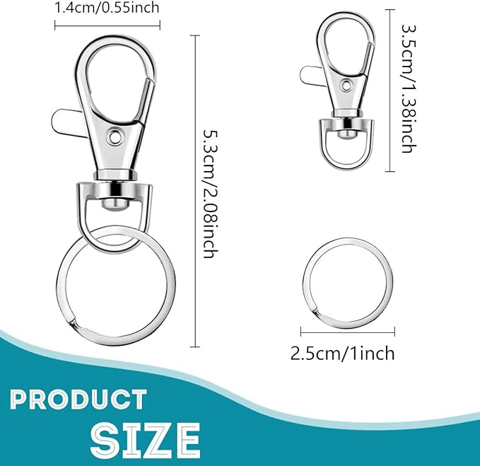 - 【Appropriate Dimension & Quantity】A package includes 50pcs swivel trigger clips and 50pcs flat key rings. The snap hook length: 3.5cm/1.38inches, width: 1.4cm/0.55inch, the key ring outer diameter is 2.5cm/1 inch. They own suitable size to match your DIY projects, art projects, keychain projects. There won’t be a situation where the keychain clip hook is too small, on the contrary, the collection with the ring is more coordinate.