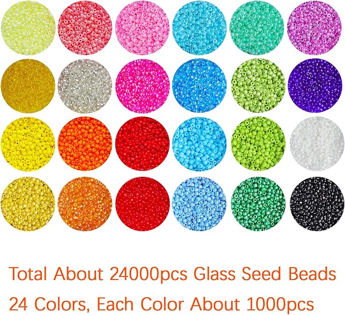 - What You Get: This set comes packed in a divided organizer box, including 24 assorted colors of glass seed beads (total approx. 24,000pcs) — plus 2pcs beading needles and 1 reel of beading thread (both matched for 2mm beads), ideal for adult DIY jewelry making.
