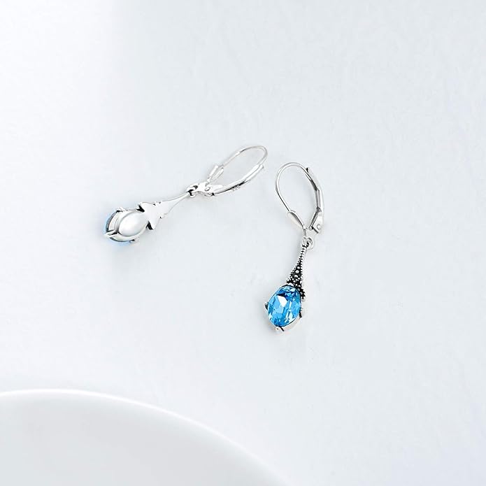 AOBOCO Vintage Earrings for Women Sterling Silver Retro Drop Dangle Leverback Earrings with 8x6mm Oval Genuine or Simulated Birthstone Crystal from Austria, Anniversary Jewelry Gifts for Her (Gift Box)