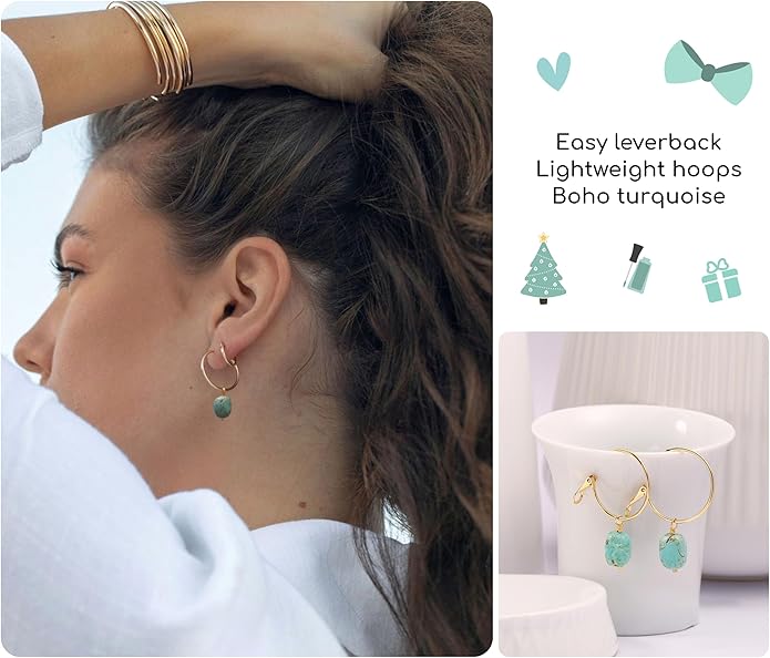 - 1. DESIGN : Our unique turquoise earrings will be the best choice for your summer earring collection. Its natural stone texture makes it goes with so many outfits in the summer vibe. And the beautiful hue of turquoise echos your eye color whether it's brown, grey, green, or blue.