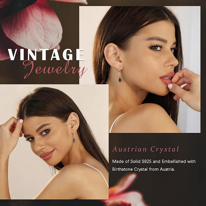 AOBOCO Vintage Earrings for Women Sterling Silver Retro Drop Dangle Leverback Earrings with 8x6mm Oval Genuine or Simulated Birthstone Crystal from Austria, Anniversary Jewelry Gifts for Her (Gift Box)