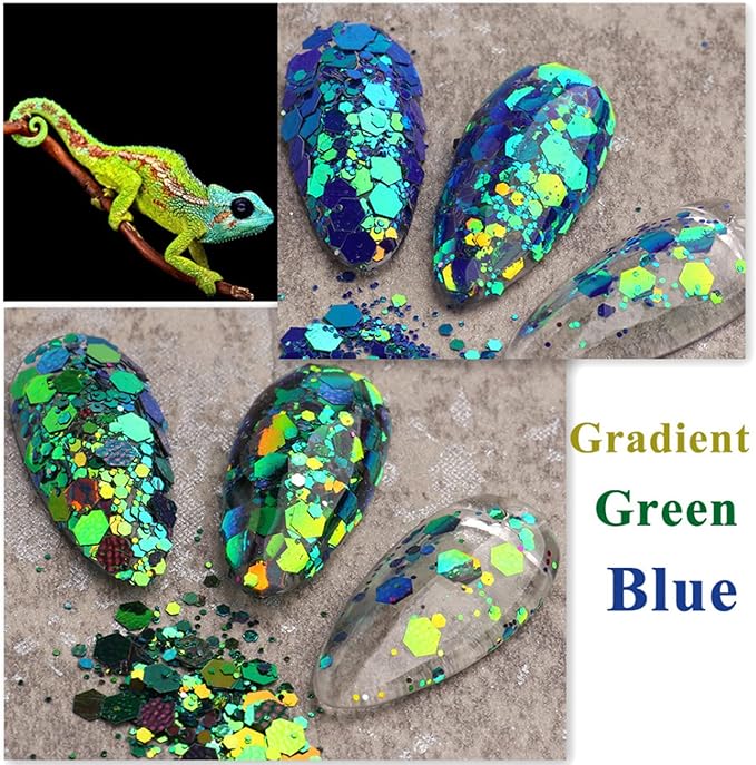 - 【Quantity】12 Colors ultra thin chameleon nail art glitter flakes, laser gradient glitters nail art design. Hexagonal Flakes in various sizes, convenient for your daily nail design.
