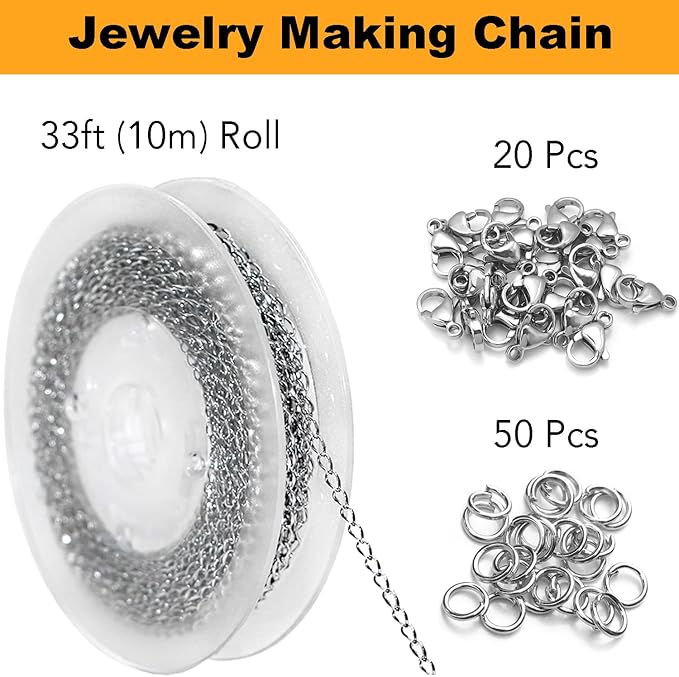 - 33 FEET ROLL SET: 33ft (10m) Silver Stainless Steel Chain Spool - 20 Silver Stainless Steel Lobster Clasps - 50 Silver Stainless Steel Jump Rings.