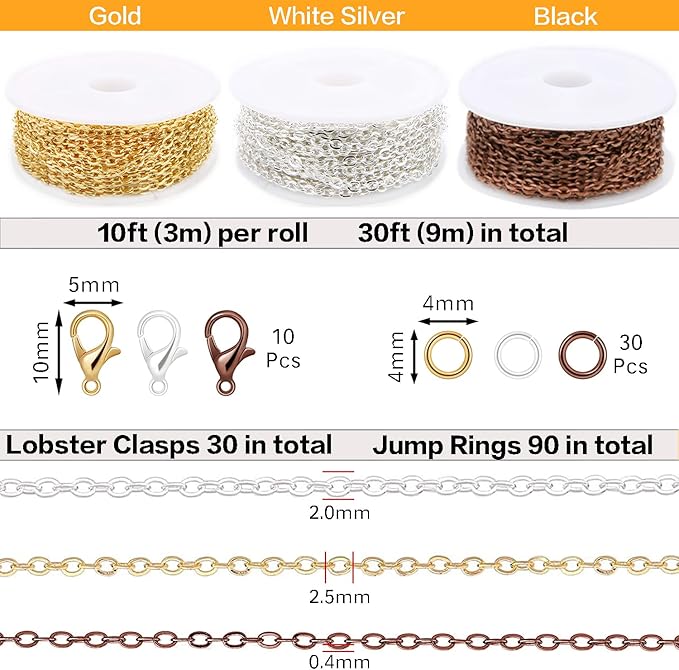 - SET OF 3 ROLLS: 3 Colors Rolls, 10ft (3m) per roll, 30ft (9m) in total; 3 Colors Lobster Clasps, 10 per color, 30 in total; 3 Colors Jump Rings, 30 per color, 90 in total.