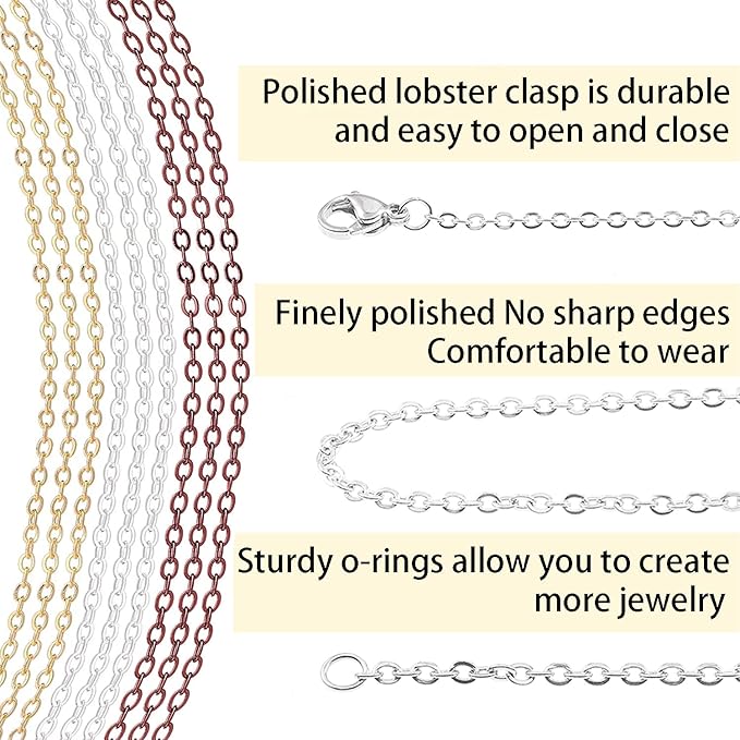 - THIN & STRONG: The size of the chain links are 2.5mm long, 2mm wide, 0.5mm thick; the lobster clasps are 10mm long, 5mm wide; the jump rings are 4mm long, 4mm wide - Small, fine, but strong and sturdy. Great for jewelry making findings supplies.