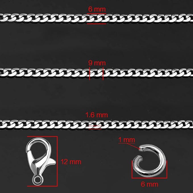 - THICK & STRONG: The size of the chain links are 9mm long, 6mm wide, 1.6mm thick; the size of the lobster clasps are 12mm long, 6mm wide; the size of the jump rings are 6mm long, 6mm wide - Large, thick, strong and sturdy. Great for mens, womens jewelry findings and supplies.