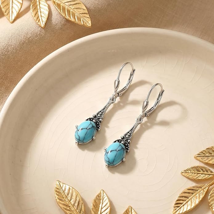 - ❤ 【SIZE INFO】Earrings Size: 1.37*0.29 inch (35*7.5mm), Created oval turquoise stone size: 8*6 mm.