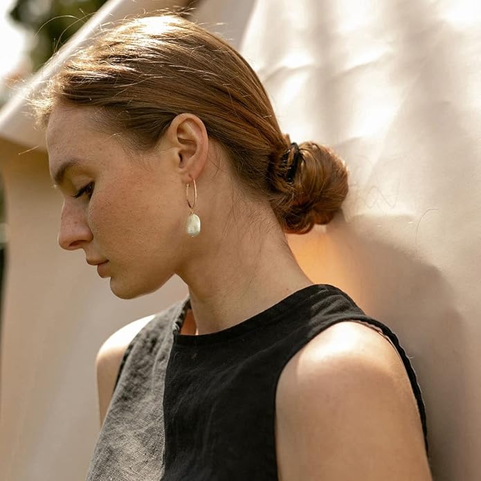 - 3. Material : The chubby shell pearls are made from high quality Mother of Pearl. Covered with authentic nacre, the natural baroque shape of the pearl earrings was given a bright shine that looked real. The big hoop earrings are made of 18k gold plated copper. The lightweight earrings may look thin but they are sturdy and comfortable to wear.