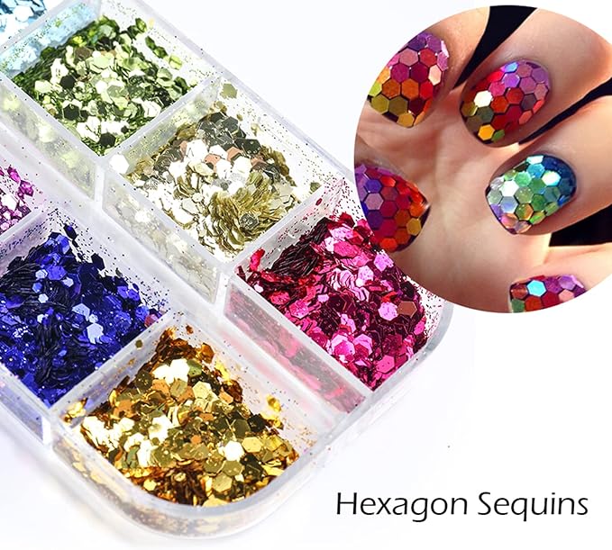 - 【Quantity】12 Colors sparkly hexagon glitter nail art flakes, 12 kinds of bright colors and patterns are arranged in 12 small grids respectively, which is convenient for your daily DIY nail decoration or facial decoration.