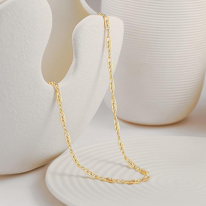 - Specifications of Gold Necklace: The link chain necklace is made of 18k gold plated metal. It features a strand of the main chain, a lobster clasp and an extender chain, simple and minimalist. The length of the 18k gold link necklace is 16”, equipped with a 2” extender chain for length adjusting. The width of the main chain is about 4mm. 6g lightweight necklace makes you wear it without an uncomfortable feeling.