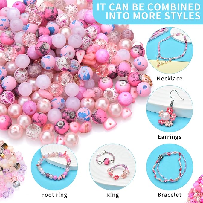 - 【200pcs Mixed Crystal Beads】: Including 8mm 40pcs round patterned beads, 20pcs crackle lampwork beads, 20pcs Imitation jade beads, 20pcs pearl beads, 20pcs polished heart beads, 20pcs transparent beads, 6x8mm 20pcs Imitation jade pony beads, 20pcs rondelle beads and 20pcs rock beads to complete this bead kit.