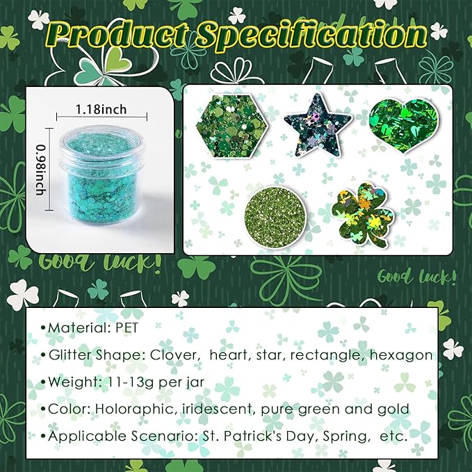- Various Shapes: Except for shamrocks leaf nail sequins, there are also heart, star, stripes, different sizes hexagons, and fine powder. You can mix and match theme colors and effects in any combination.