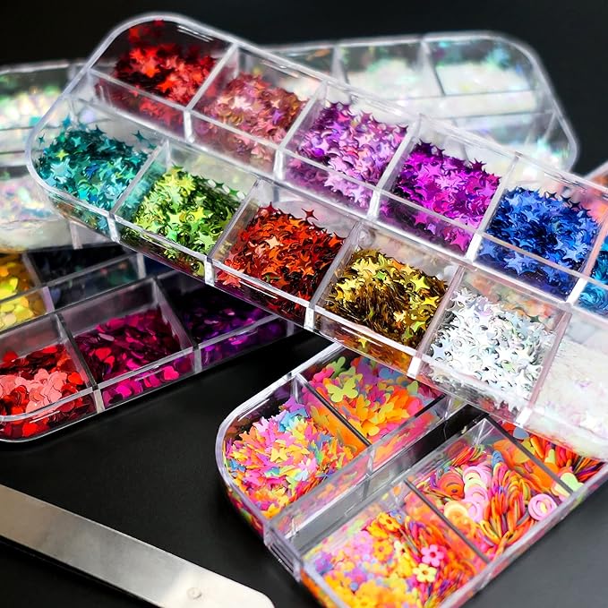 - Multi-shape: 1 box 12 colors holographic star nail glitter flakes, 1 box 12 holographic heart glitter, 1 box 6 colors Iridescent chunky glitter flakes, 1 box of mixed shaped round star heart butterfly flower letter nail glitter