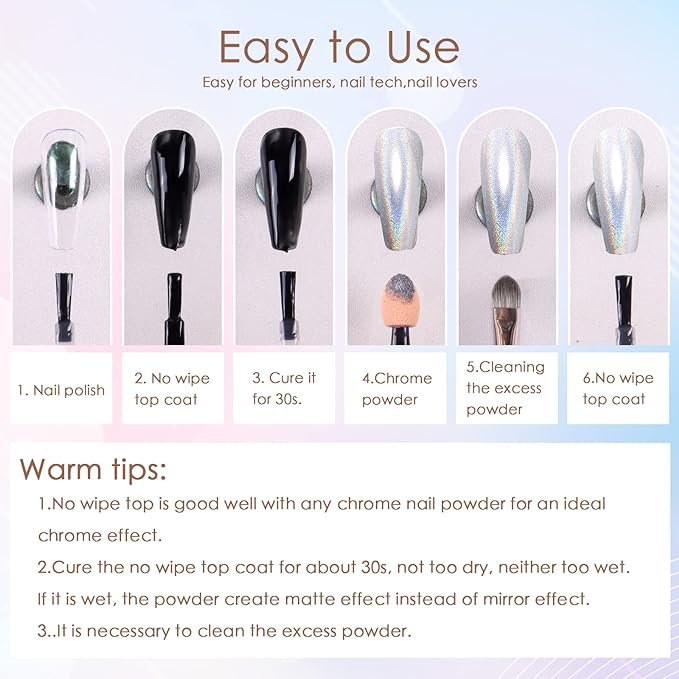 - Wide Application: The nail chrome powder is suitable to be applied on UV gel nails, acrylic extension and natural nails. It can also perfectly match with chameleon flakes, nail charms, bubble effect, water ripple pattern, French manicure, 3D shell nails and etc. Just unleash your creativity.