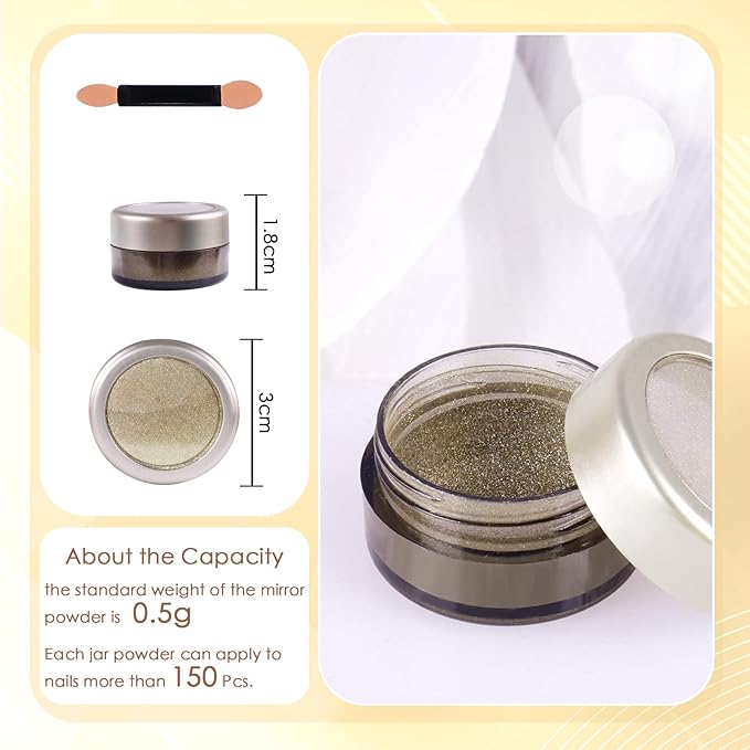 - What You Will Receive: 1 jar of premium chrome powder for nails and a sponge stick (used to apply chrome powder) each package. Each jar contains 1 gram of nail pigment powder for long-time use. And jar was well-sealed to prevent the chrome pigment powder from coming out.