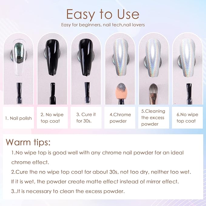 - Usage: The chrome nail powder for gel polish is a must-have nail accessory for DIY polish gel nail art beginner or technician. Just equip yourself with UV/LED lamp, no-wipe top coat, and most importantly, Laza chrome powder, then follow the detailed application guide provided on the bottom of this page, and you will create glazed chrome nail in six steps without any special nail art skill.