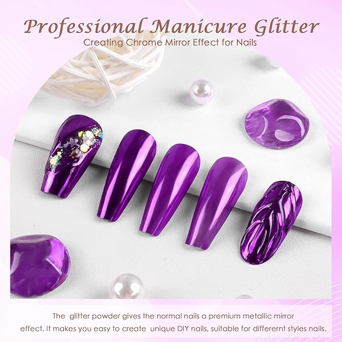 Laza Chrome Nail Powder Mirror Effect Metallic Dust Holographic Glitter Glazed Manicure Decoration Reflective Pigment for DIY Gel Polish Nail Art, Resin Craft, Gifts - Purple