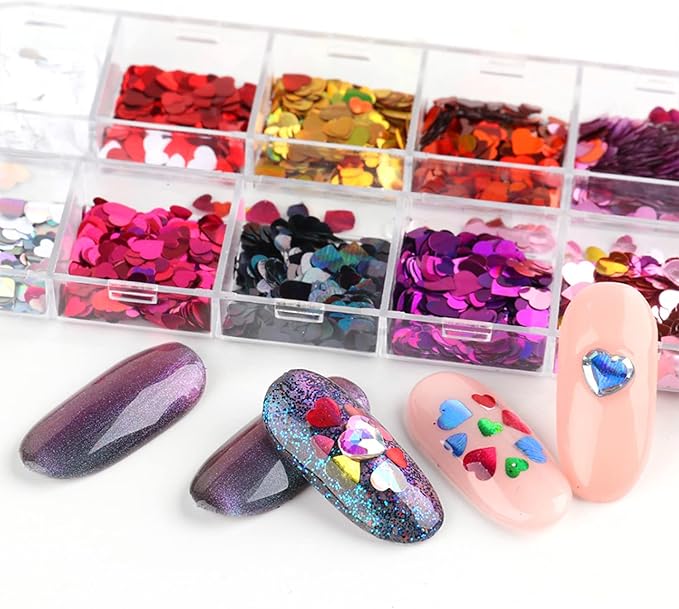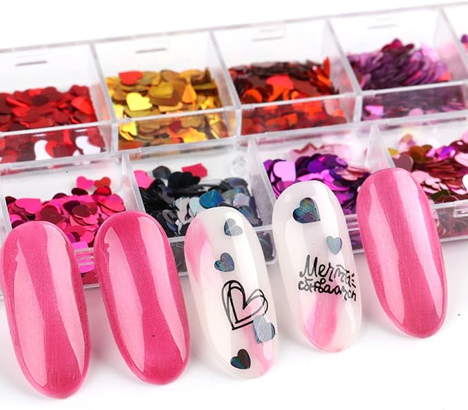 - 【Quantity】12 Colors sparkly love heart glitter nail art flakes, 12 kinds of bright colors and patterns are arranged in 12 small grids respectively, which is convenient for your daily DIY nail decoration or facial decoration.