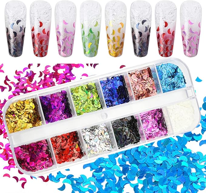 - 【Quantity】12 Colors sparkly moon glitter nail art flakes, 12 kinds of bright colors and patterns are arranged in 12 small grids respectively, which is convenient for your daily DIY nail decoration or facial decoration.