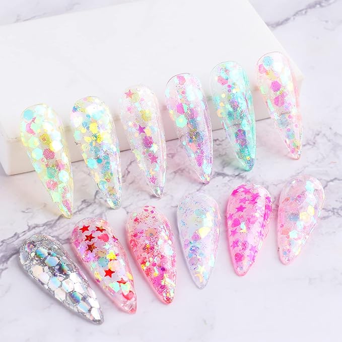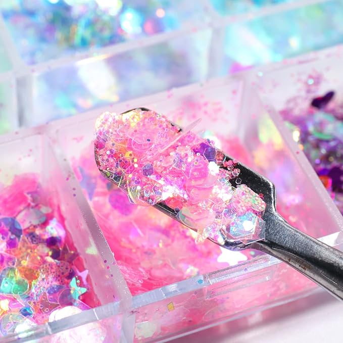 - 【Quantity】12 Grids transparent mermaid irregular nail art glitter flakes, 12 small grids separate the packaging and prevent the product from spilling, which is convenient for your daily DIY nail decoration or facial decoration.