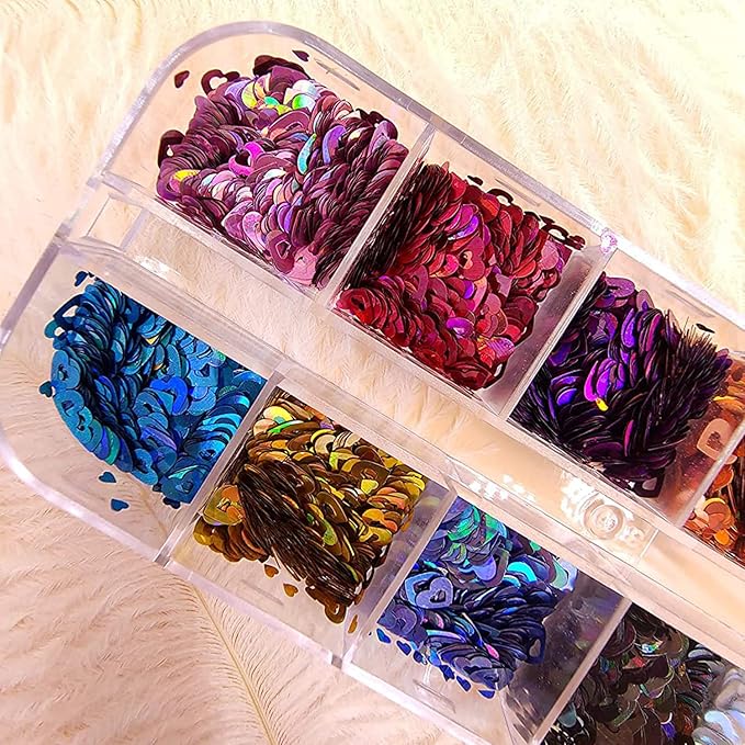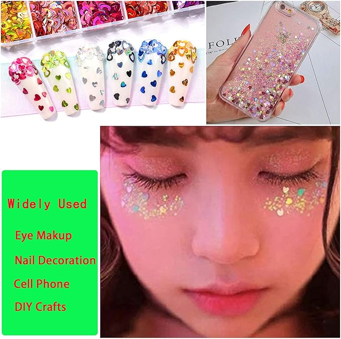 - 【Quantity】12 Colors sparkly hollow heart glitter nail art flakes, 12 kinds of bright colors and patterns are arranged in 12 small grids respectively, which is convenient for your daily DIY nail decoration or facial decoration.