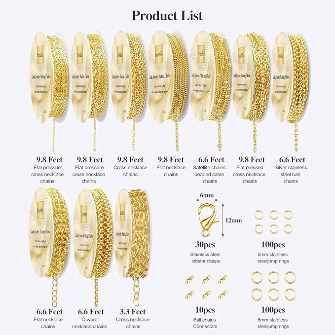 - Package Includes: Total 78.7 feet 10 rolls gold necklace chains bulk, with 100pcs 5mm jump rings,100pcs 6mm jump rings,30pcs lobster clasps for decorative chain jewelry making. Complete accessories kit can make many beautiful jewelry chains.