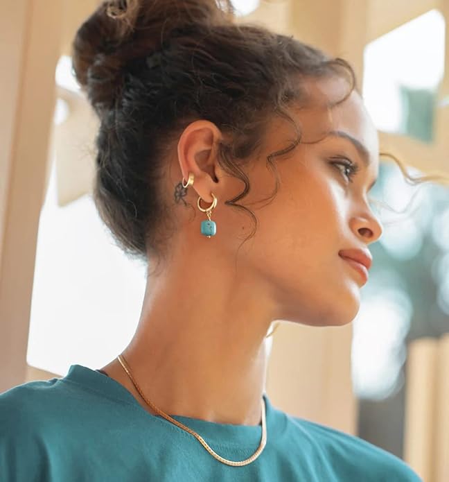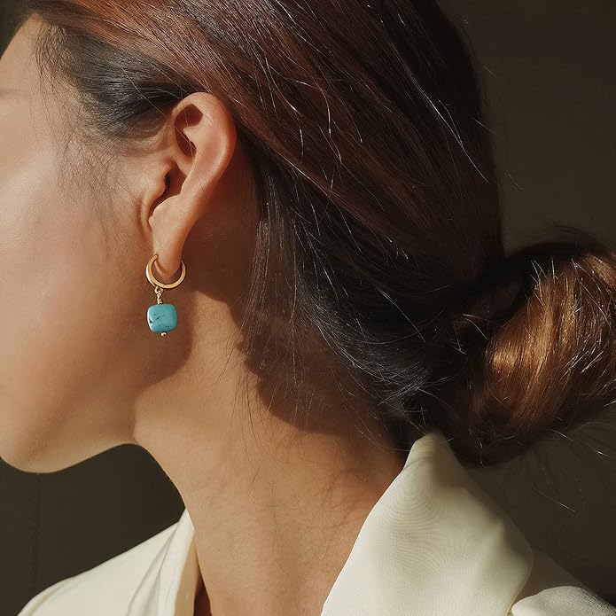 - 2.DESIGN: In any collection of essential pieces of jewelry, hoop earrings are, without a question, a must-have for an effortless fashion. And our huggie earrings feature a dangling turquoise stone of a half-cube sugar shape as the charm. The vibrant color of the blueish turquoise earrings is no doubt refreshing, which will echo your beautiful blue eyes and stand you out in a casual way.