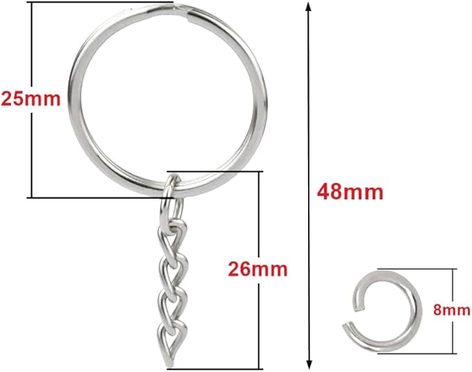 - Size : Key ring diameter is 1inch (25mm), the chain is approx 1.05 inch (26.5mm) in length, and the open jump ring is 0.32 inch (8mm) in diameter.