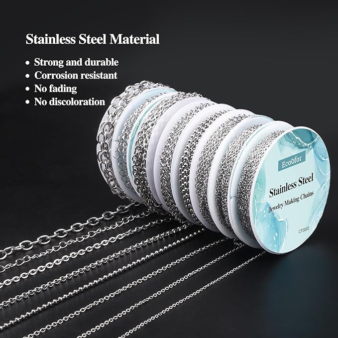 Ecoofor Necklace Chains for Jewelry Making, 62.3 Feet 8 Rolls 304 Stainless Steel Jewelry Chains for DIY Necklace Bracelet Jewelry Making with Stainless Steel Jump Rings/Lobster Clasps/Connectors