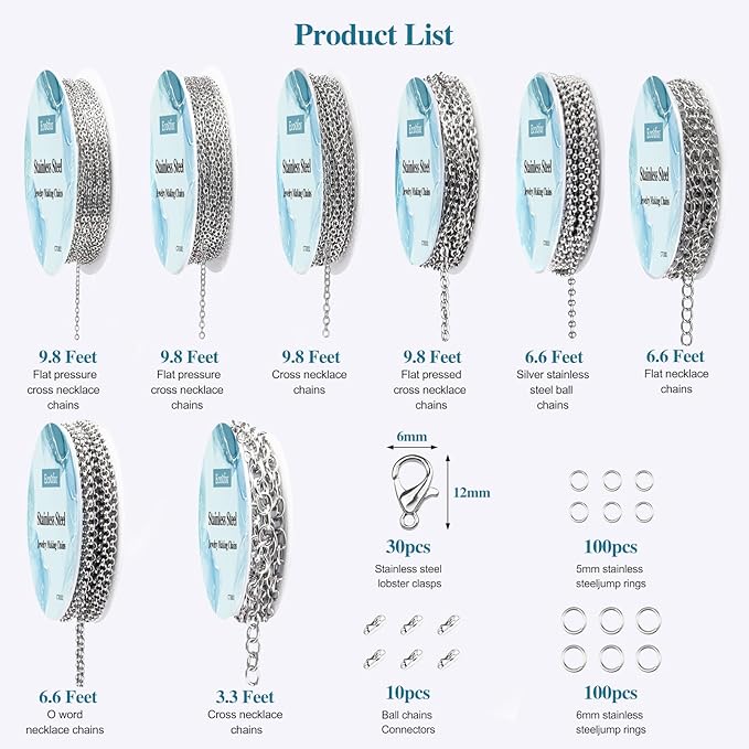 - Complete Kit: Total 62.3 feet 8 rolls stainless steel necklace chains, with 100pcs 5mm stainless steel jump rings,100pcs 6mm stainless steel jump rings,30pcs stainless steel lobster clasps for decorative chain jewelry making. Complete accessories kit can make many beautiful jewelry chains