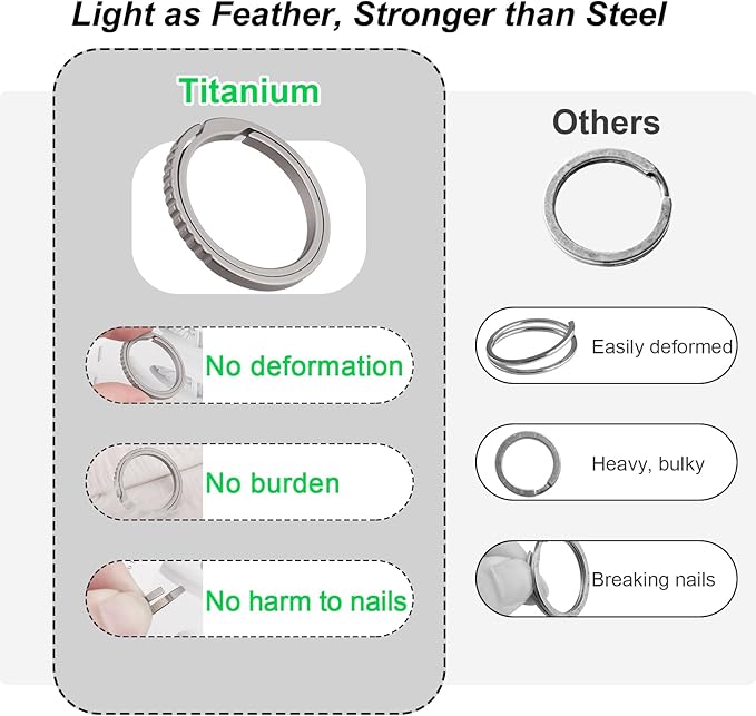 - Non Corrosion & Anti-falling Titanium Keyrings: These titanium keychain ring will maintain its shape and stay as new after years’ use. The key ring stays closed to hold keys securely and will not deform by accident in rough daily use. It is one purchase for a lifetime.