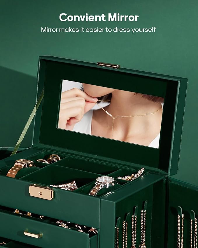 Homde Synthetic Leather Huge Jewelry Box Mirrored Watch Organizer Necklace Ring Earring Storage Lockable Gift Case (Forest Green + Gold)