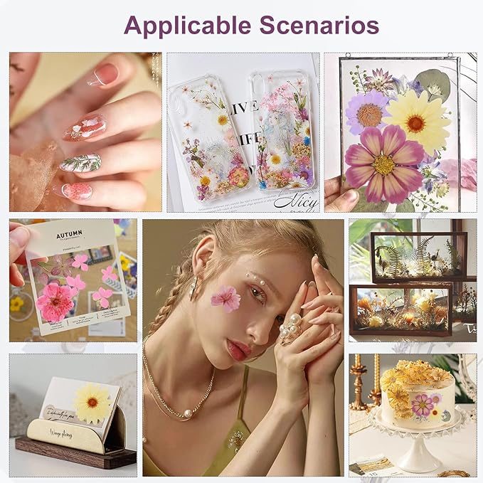 - Different usages: Natural pressed flowers for resin can be widely applied for nail art, resin molds, DIY jewelry design, resin phone case, note card, stationery, wedding invitations, envelopes, stained glass, bookmarks, candle makers, soap making, table decorations, scrapbooking, furniture and wood workings