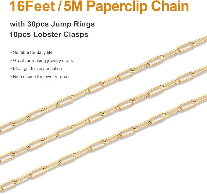 - [16 Feet Jewelry Making Chain]: The package includes 5 meters stainless steel chain for jewelry making, 10 pieces lobster clasps and 30 pieces open jump rings. The flat paperclip link chains bring it more classic style, with the additional jewelry making supplies, it is convenient for your to create personanized necklace, bracelet, ankle, earrings, keychain crafting, etc.