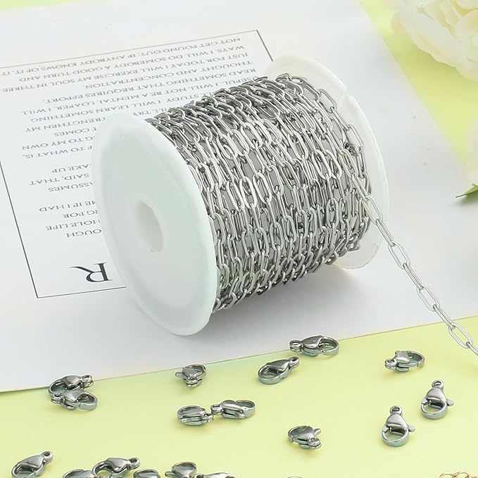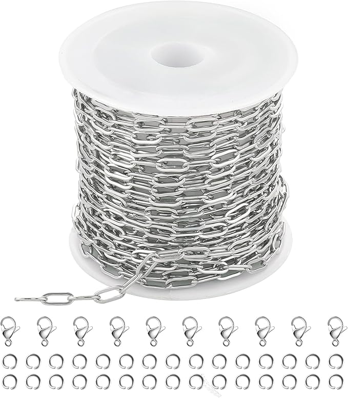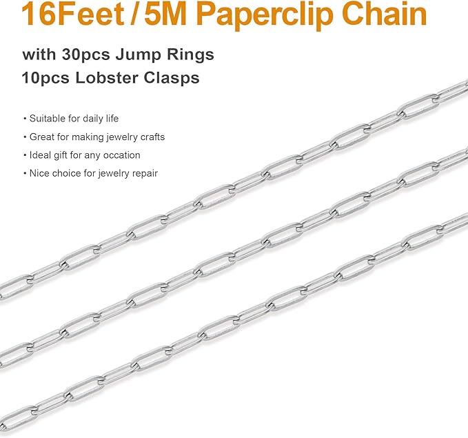 - [16 Feet Jewelry Making Chain]: The package includes 5 meters stainless steel jewelry chain bulk, 10 pieces lobster clasps and 30 pieces open jump rings. The flat paperclip link chains bring it more classic style, with the additional jewelry making supplies, it is convenient for your to create personanized necklace, bracelet, ankle, earrings, keychain crafting, etc.