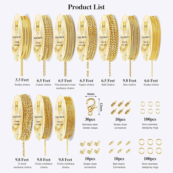 - Complete Jewelry Making Kit: 75.5 feet 10 rolls gold necklace chains, comes with all necessary accessories such as 100pcs 5mm jump rings,100pcs 6mm jump rings,30pcs lobster clasps, ball chain connectors, snake chain connectors.
