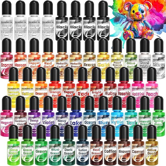 - HIGH CONCENTRATION - Our alcohol ink set features 54 highly concentrated colors perfect for creating stunning epoxy resin arts and crafts. Includes classic and pearl colors. There are 4 black and 4 white, the white ink allows the colors to sink in so that subsequent colors are more vibrant. Mix and match these vibrant alcohol ink to achieve rich color effects in your projects.