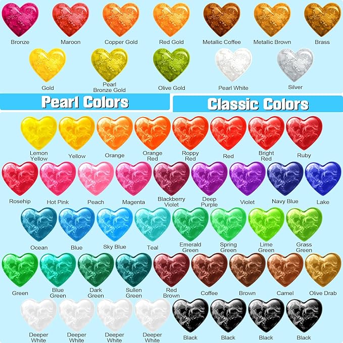 - STORAGE AND PRECAUTIONS - Store resin dye upright to preserve the integrity of the pigment. The set comes with instructions, disposable gloves and a bottle opener for easy use. Pearl colors may settle, so shake well before use. The net content of each bottle is the same. If some colors are at different heights, it may be because the density of different colors is different.