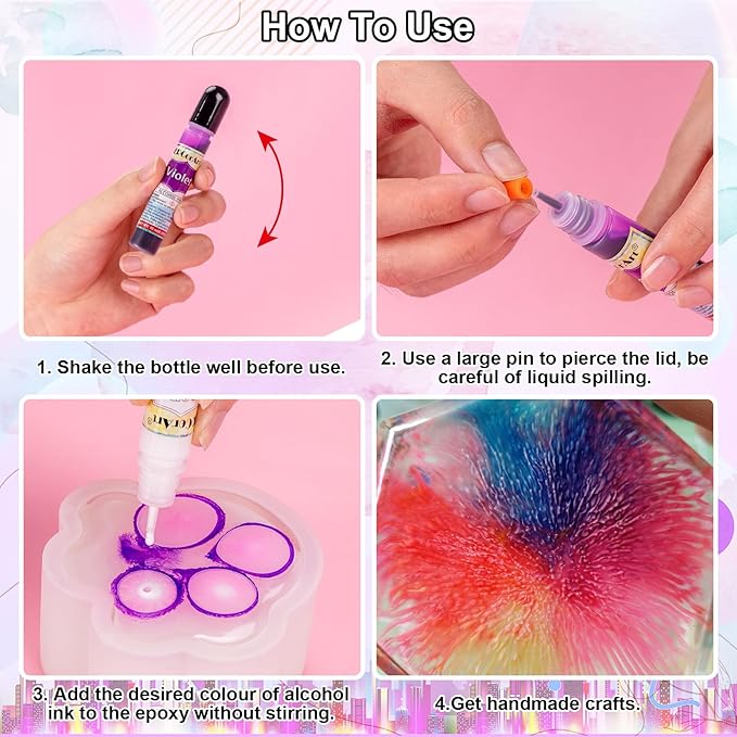 - Versatile Applications - Ideal for various art projects, our alcohol inks set are perfect for resin art, coasters, tumbler making, glassware, paperweights, acrylic paintings, and other alcohol ink creations. However, please note that they are not suitable for use with UV resin. Unleash your creativity and explore endless possibilities with our premium resin pigment!
