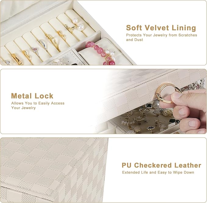- Unique & Durable Jewelry Organizer Box: Elegant light khaki color with checkered pattern and a smooth metal buckle for easy opening and closing, soft velvet lining, quality PU and sturdy construction for durability and style