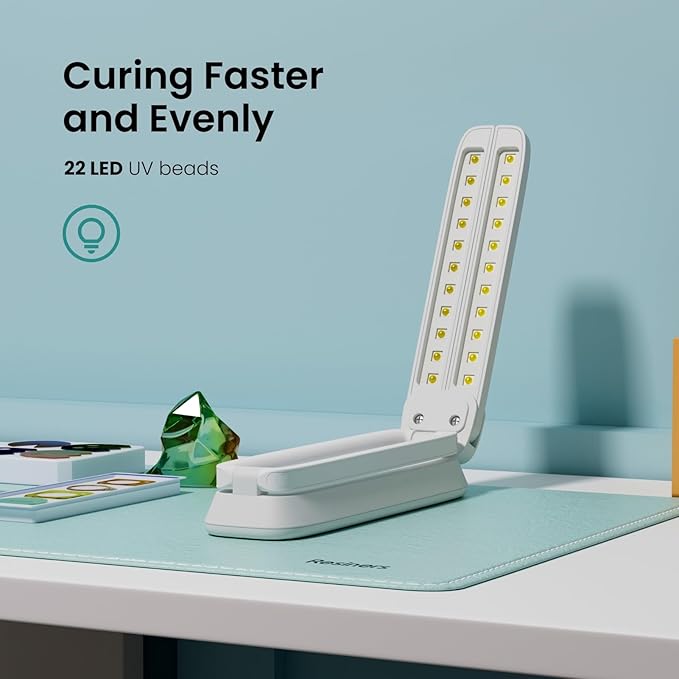- ๐ ๐๐ฌ๐ญ-๐๐ฎ๐ซ๐ข๐ง๐ ๐๐ ๐๐ข๐ ๐ก๐ญ: Equipped with 22 UV beads, this uv lamp can continuously and stably emit ultraviolet rays with a wavelength of 320-420nm. It cures UV glue faster, more evenly, and more scientifically, significantly improving your work efficiency. Quickly complete the production of resin jewelry, earrings, pendants, coasters, trays, and other crafts