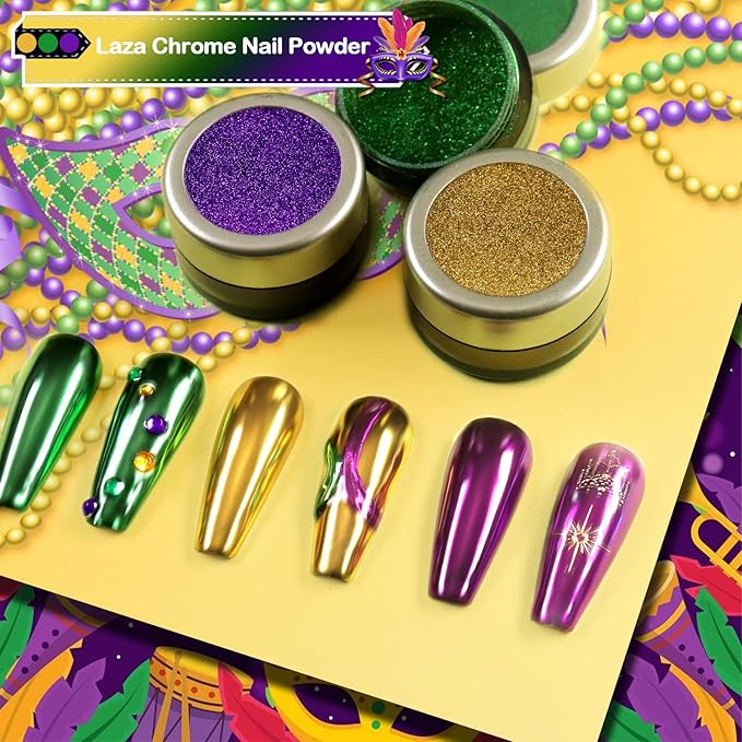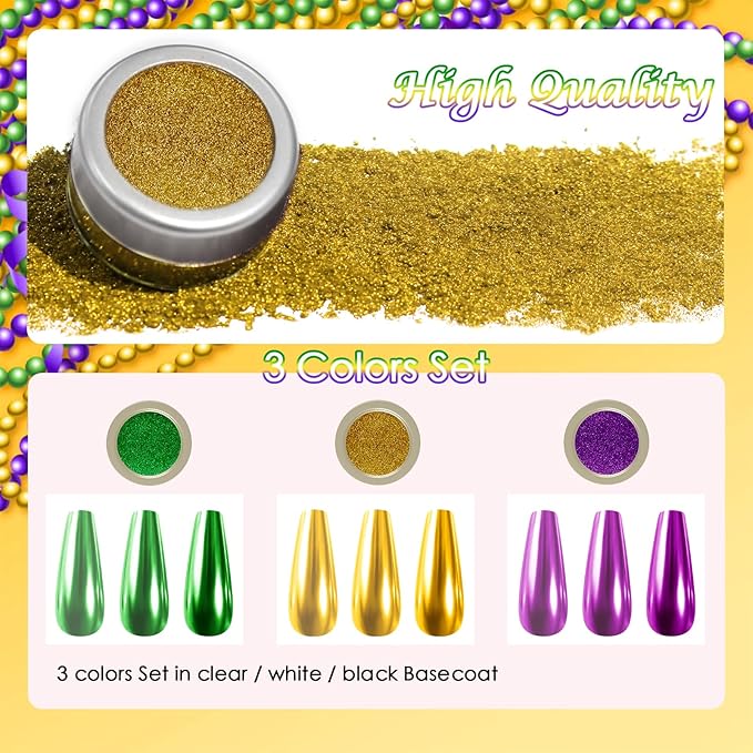 - What You Will Receive: 3 premium colors of chrome powder for Mardi Gras (gold, green, purple) and 3 sponge sticks each package. Each jar contains 1 gram of nail pigment powder for long-time use. All jars are well-sealed to prevent the chrome pigment powder from coming out.