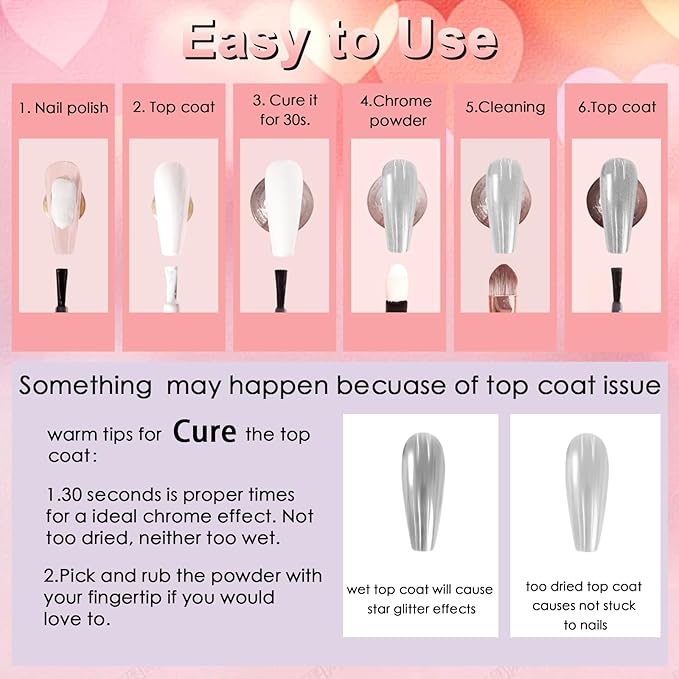 - Ultra Excellent Texture: The valentines day nail art chrome nail powder is fine and smooth without particles, making nails with an amazing mirror effect. And the pink red chrome nail powder is non-toxic, more durable and environmentally friendly, which does not harm your nails and skin, using red pink chrome powder more at ease. Make mirror effects for nails with our excellent pink red chrome nails powder set.
