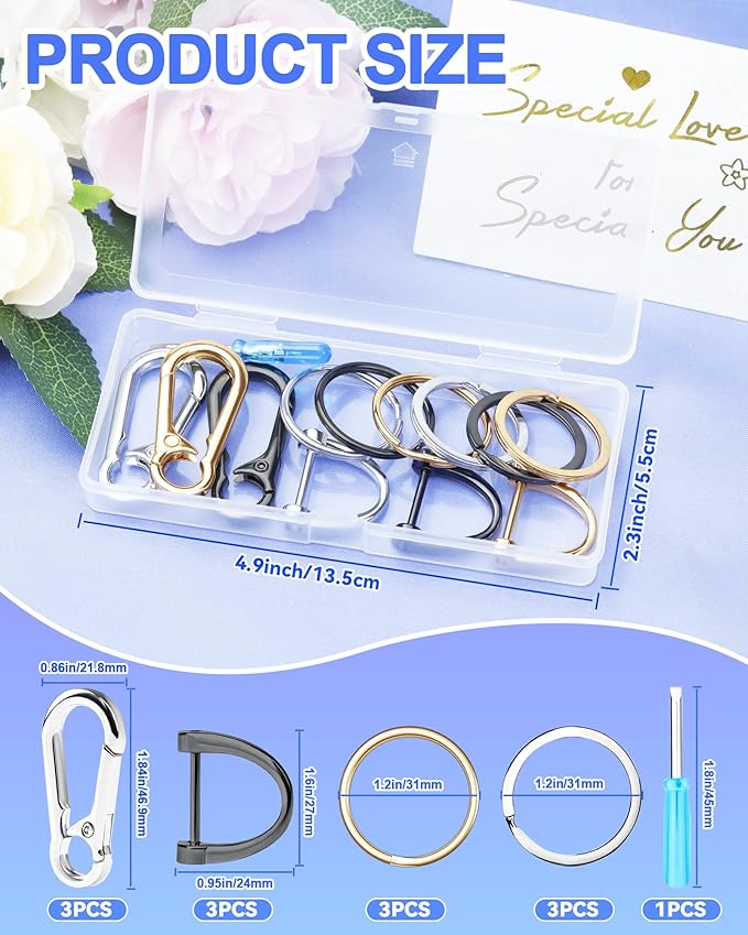 - Complete Kit for Versatile Use: This Keychain Rings Kit includes three keychain clips, three thin key rings, three thick key rings, three D-shaped key rings, and a mini screwdriver. Perfect for organizing key rings for car keys.