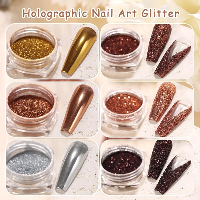 - 【You Will Get】 6 jars nail glitter in one set, including 3 jars of metallic mirror effect chrome nail powder (gold, silver, champagne) and 3 jars of holographic sugar glitter.
