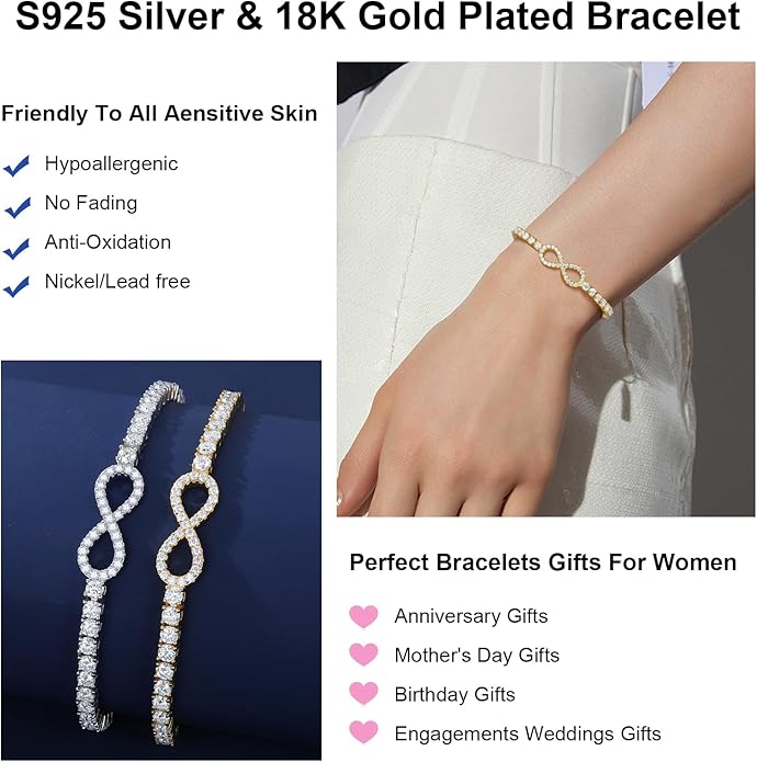 - 【 925 Sterling Silver Bracelet 】 Made of 925 sterling silver, this hypoallergenic 925 sterling silver tennis bracelet will not turn your skin green, red, or itchy. The 18k gold plating on the surface makes the womens bracelet more durable, ensuring that it will last a long time and accompany you during every important moment. Every detail on the sterling silver gold bracelet has stood the test of time, and the quality is reliable.