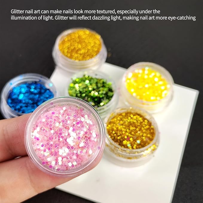 - Easy to Use: Suitable for both professional nail technicians and DIY enthusiasts.Can be applied with nail glue, gel or regular nail polish to create beautiful glitter nail effects with ease.